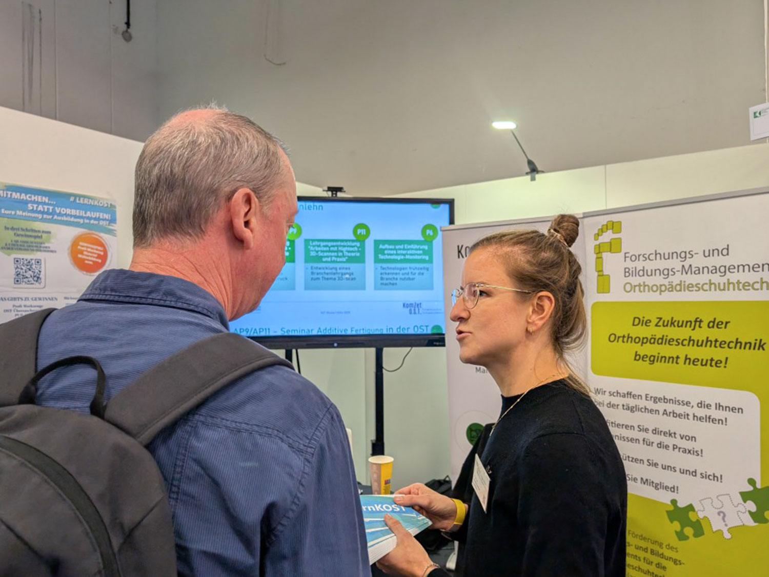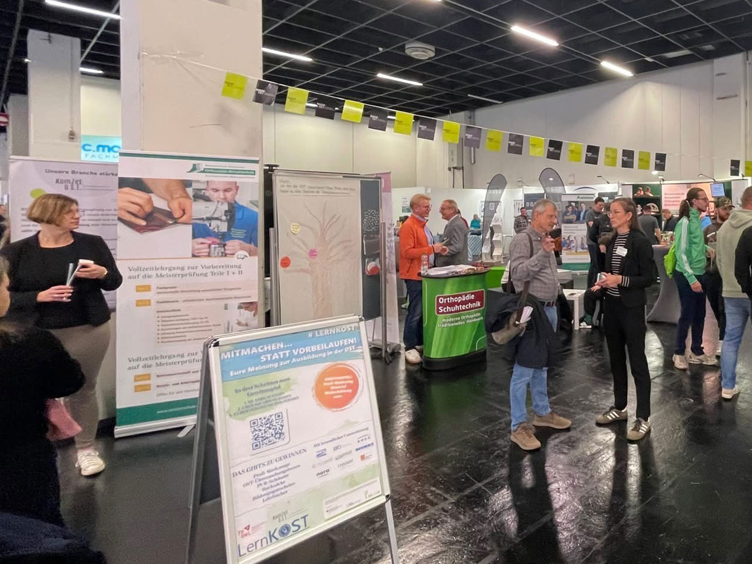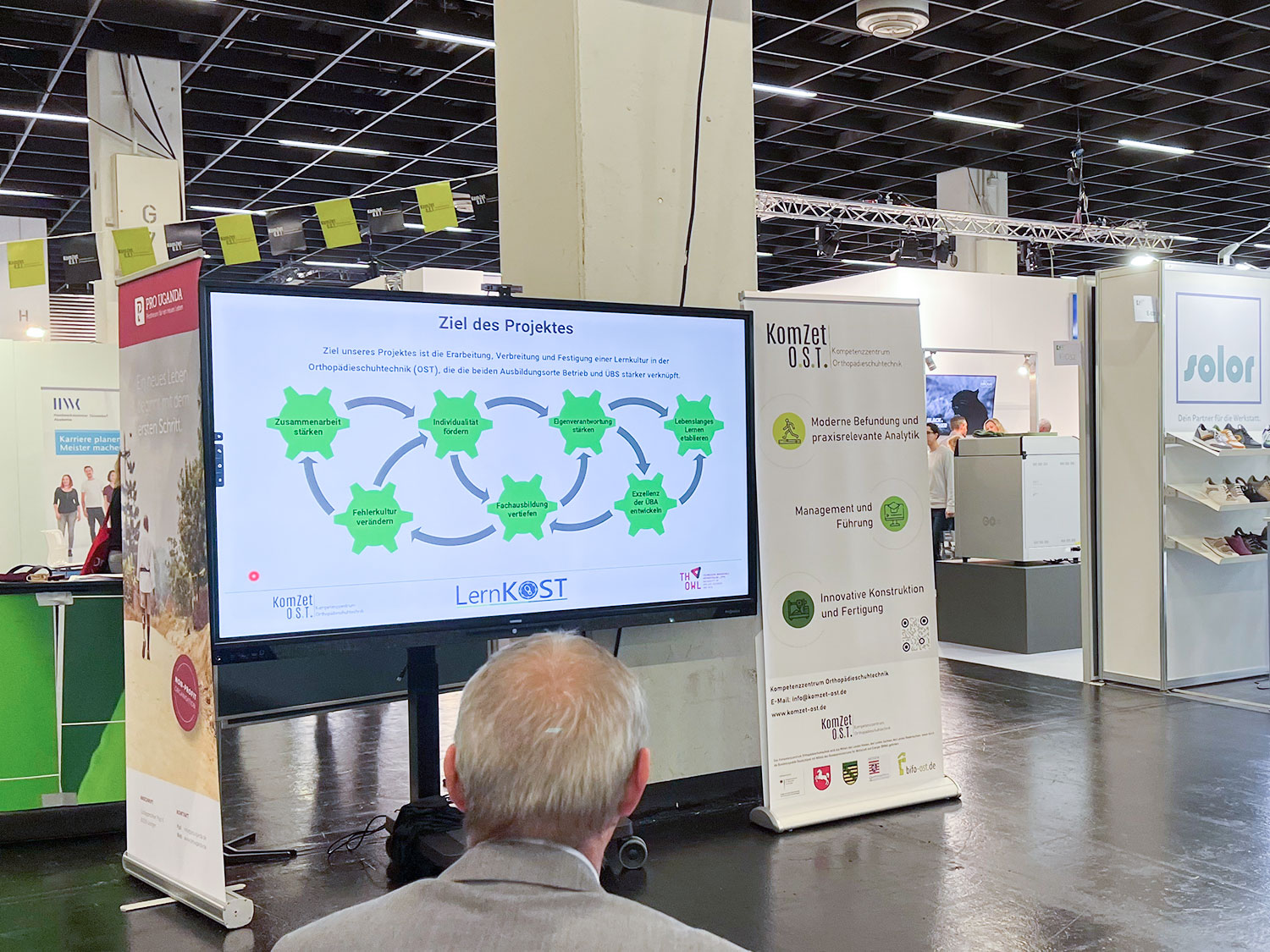Die Campusfläche und der Stand des Kompetenzzentrums Orthopädieschuhtechnik (KomZet O.S.T.) bildeten für unser Förderprojekt „LernKOST“ – Lernkultur für die Orthopädieschuhtechnik, die wichtigsten Kontaktpunkte. Multimediadisplays machten Ziele und Vorgehensweise des Projekts sichtbar, während der offene Rahmen intensive Gespräche mit Auszubildenden, Ausbildenden sowie Vertreterinnen und Vertretern aus Betrieben und der Branche förderte. Das im Rahmen der Förderinitiative „INex-ÜBA“ geförderte Projekt hat zum Ziel, mithilfe von neuen didaktischen Konzepten eine Lernkultur zu festigen, die die beiden Lernorte Betrieb und ÜBS stärker verknüpft.