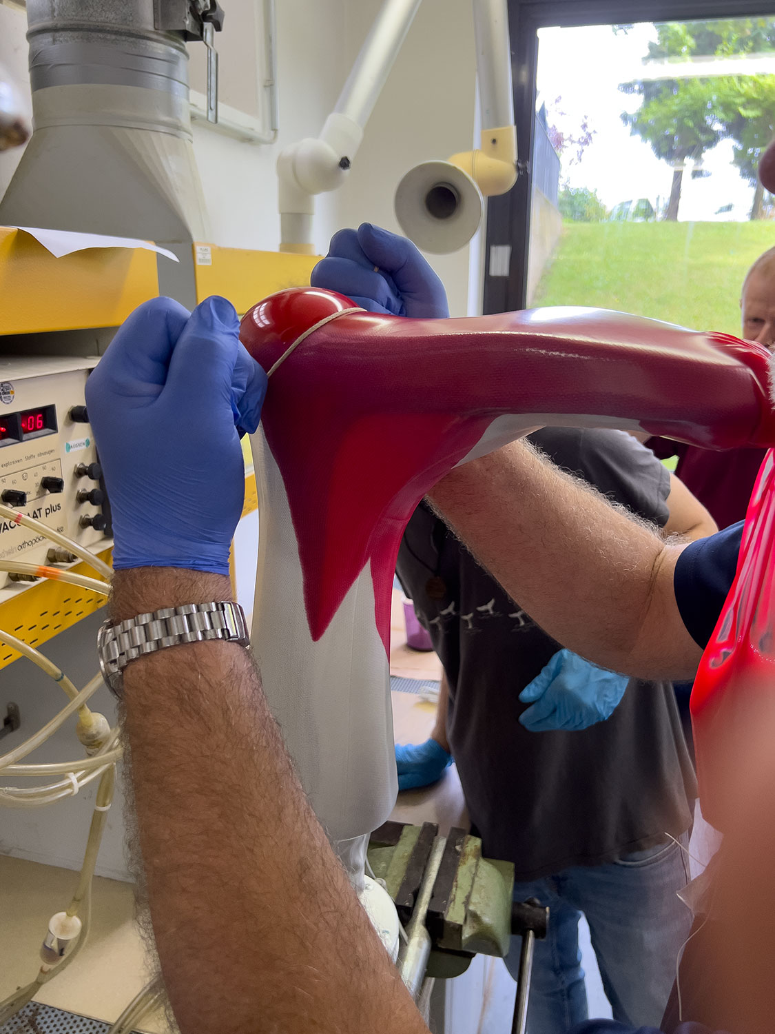 Auch der persönliche Austausch kam nicht zu kurz: Beim gemeinsamen Abendessen am Freitag wurden Arbeitsschritte, Materialvarianten und Versorgungsstrategien weiterdiskutiert – ganz nach dem Motto: Der Harz ist längst ausgehärtet, aber der Kopf laminiert noch weiter. Am zweiten Kurstag wurden die Arbeiten fertiggestellt, präsentiert und in einer Abschlussrunde reflektiert. Viele Teilnehmende konnten neue Techniken mitnehmen, andere ihre bisherige Vorgehensweise gezielt schärfen – alle gingen mit einer fertigen AFO und vielen Ideen nach Hause.